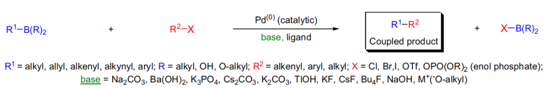 在碱存在下有机硼试剂和芳香或烯基卤代物(或芳香三氟甲磺酸酯)在钯催化下进行交叉偶联的反应。