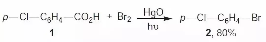 1939年,H. Hunsdiecker报道了干燥的脂肪羧酸银和溴反应可以得到少一个碳原子的溴代烷烃。脂肪羧酸,α,β-不饱和羧酸和特定的芳基甲酸进行脱羧卤代得到少一个碳原子的卤代烷烃的反应被称为Hunsdiecker反应。