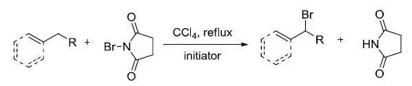 NBS(N-溴丁二酰亚胺)在自由基引发条件下对烯烃的烯丙位或芳烃的苄位进行取代得到烯丙基溴或苄溴的反应。常见的自由基引发条件有:自由基引发剂,加热或光照。四氯化碳是最常用的溶剂。