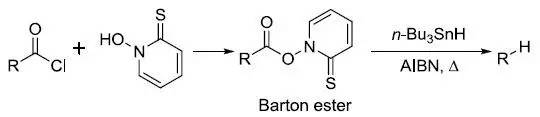 羧酸转化为Barton酯,然后进行自由基脱羧的反应。