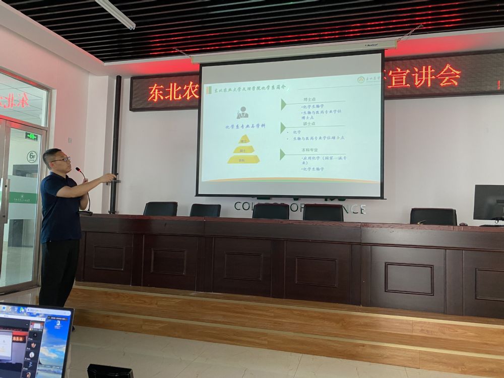 为深入学习党的二十大精神,坚定不移听党话、跟党走,培养更多知农爱农新型人才,6月30日,best365中国官方网站开展“学习党的二十大,知农爱农二十讲” 主题宣讲活动,特别邀请东北农业大学文best365中国官方网站经理、化学学科带头人付颖教授、东北农业大学首席教授、黑龙江省教学名师叶非教授、东北农业大学化学系副主任刘豫龙副教授到校做研究生招生宣讲。
