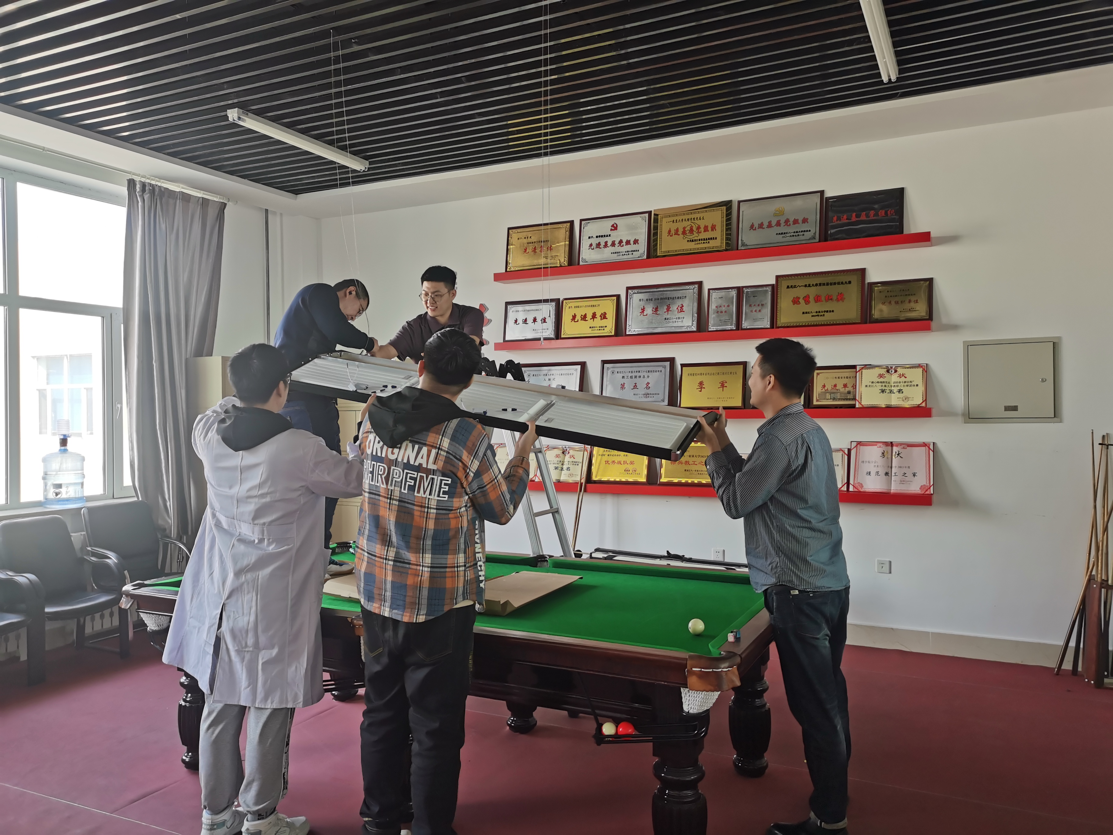 在安装过程中,工会委员及志愿者们积极参与,后勤管理处增派人员帮忙维修电路,全体人员密切配合,确保了安装工作的顺利进行,保证了设备的质量和安全性。目前,台球架和台球灯已经成功投入使用,新的设施设备不仅提高了教工之家的娱乐氛围,也吸引了更多的教职员工前来休闲娱乐。