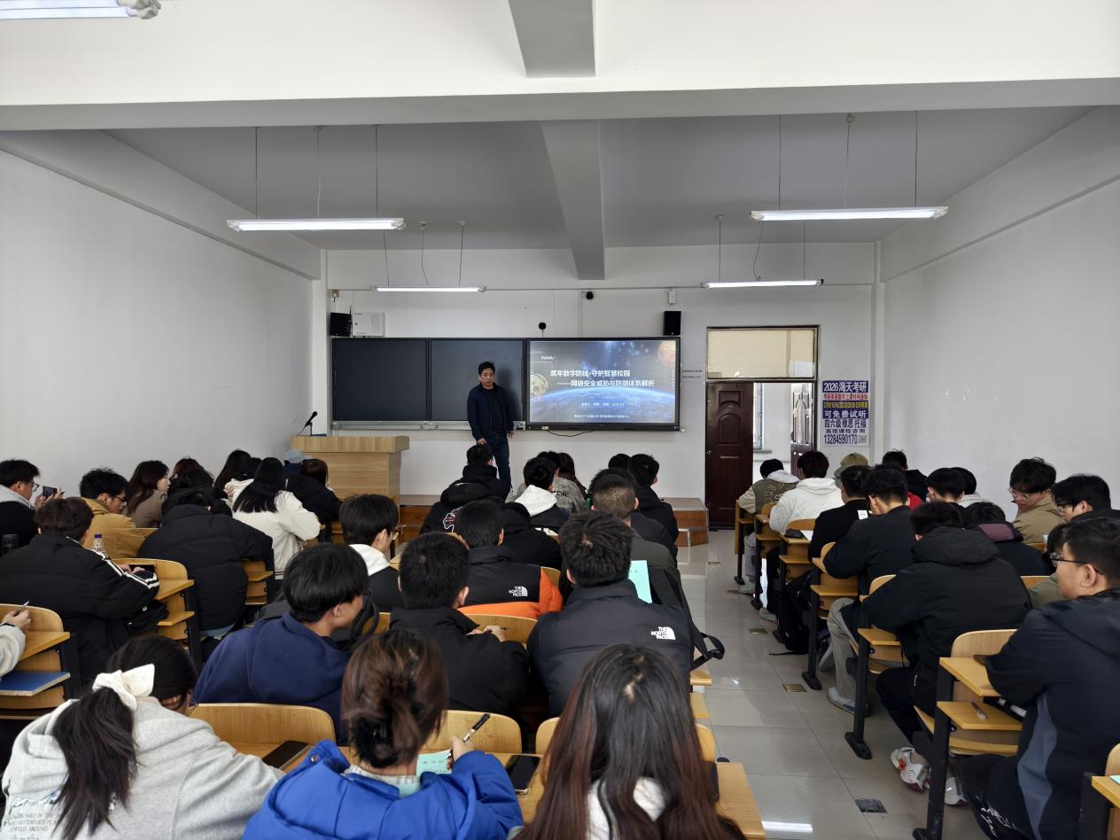 同时,针对2024级新生开设的专业认知实习讲座,以“网络安全的时代使命”、“全球与中国网络安全威胁”、“新技术环境下的安全事件”、“本校网络安全威胁与防御实践”、“个人安全防护与资源推荐”五大模块构建完整知识体系,系统解析网络安全战略意义、跨境攻击新特征、零信任架构实施路径,并结合实时威胁监测大屏进行场景化演示,有效增强数字时代员工的安全认知与防范能力。